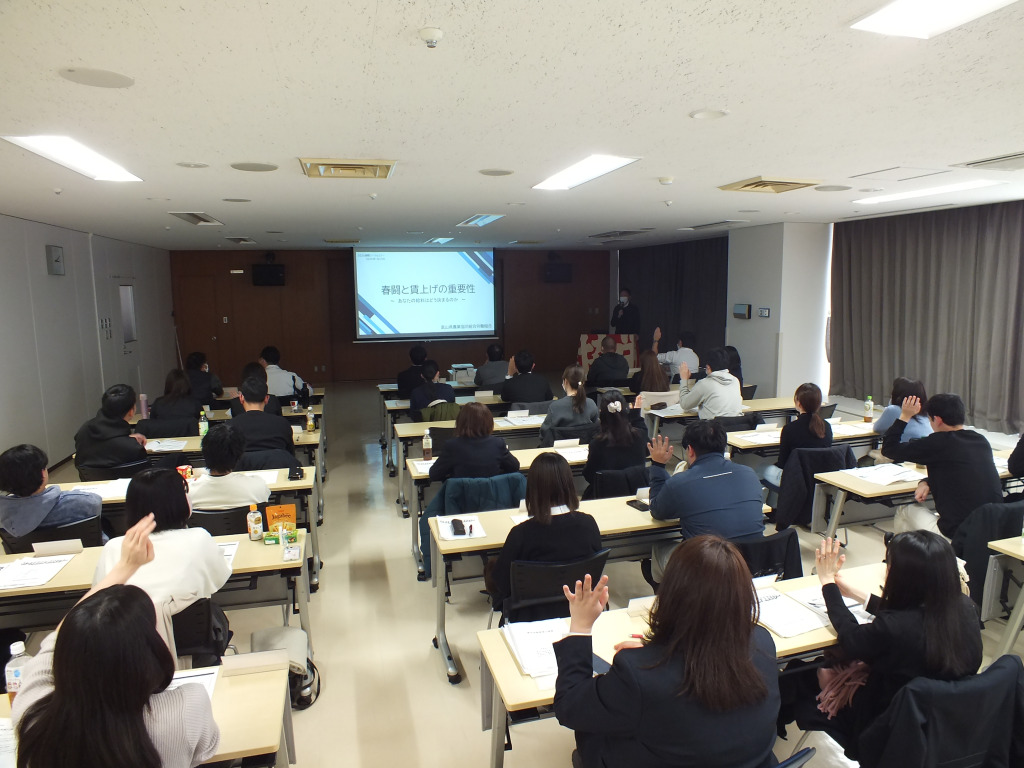2026.3.13雪の影響で1月開催予定だったユース委員会の春闘セミナーを開催し、10支部41人が参加しました。セミナーでは、①富山県農業の課題②農協の金融事業の課題③春闘と賃上げの重要性④賃金交渉に関するケーススタディをそれぞれ学習し、今後労働組合の担い手であり、農協を支えていく人財であるユース委員の知識向上を図りました。